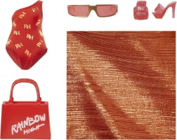 Obsahuje červený vršek a zlatou sukni s doplňky jako červená kabelka a sluneční brýle.