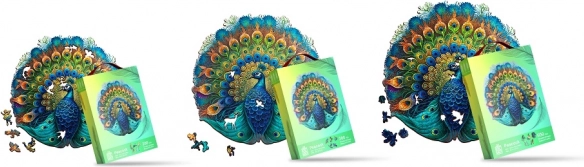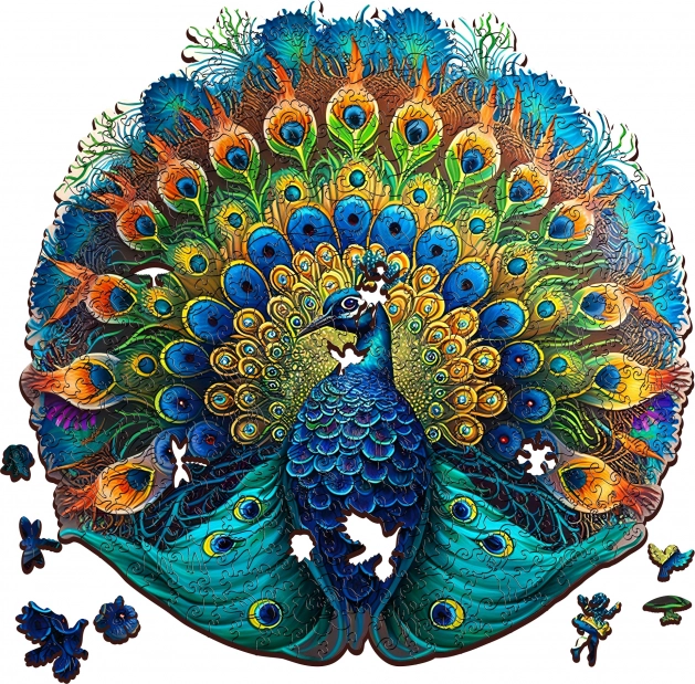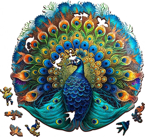 Toto dřevěné puzzle v podobě páva ohromí svým nádherným designem a živými barvami. Díky UV digitálnímu tisku se barvy stávají reálnějšími a uchvátí každého milovníka skládacích umění.