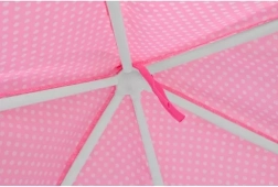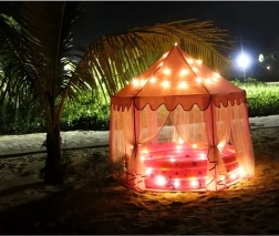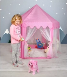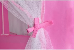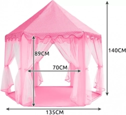 Tento růžový dětský stan vytváří útulný „palác“, kde se rozvíjí dětská představivost. Šestihranná základna poskytuje dostatek prostoru pro polštáře, plyšáky i knížky, zatímco průsvitné záclonky ze síťoviny na šesti vchodech dodávají pocit soukromí a zároveň zajišťují skvělou cirkulaci vzduchu. Stan je vhodný pro hru až pro 2 děti pod dohledem dospělých.