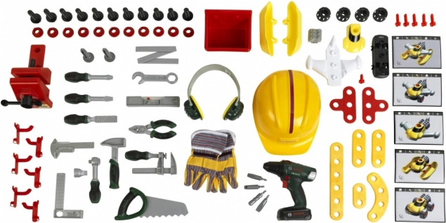 - Aku šroubovák (světlo a zvuk), šroubováky (plochý a křížový), klíč, ráčna, kleště, pilník, kladivo, pila, měřítko, úhelník, pravítko, svěrák, šrouby, matky, stavební díly, háčky, úložné boxy, ochranná helma, brýle, chrániče sluchu, rukavice