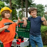 Velký pracovní stůl s pegboardem, svěrákem a množstvím příslušenství poskytuje dětem autentické kutilské prostředí a dlouhé hodiny tvořivé hry.