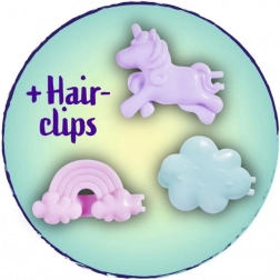 Evi má dlouhé růžové vlasy a barevné sponky ve tvaru obláčku, duhy a jednorožce pro nekonečné účesy.