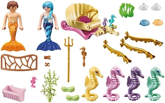 - 2 figurky mořských víl, 4 velcí mořští koníci, podmořský kočár, ozdobné mušle s přísavkami, příslušenství