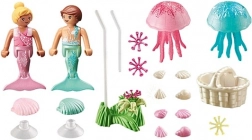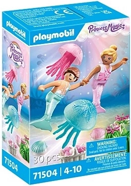 Objevte zábavná dobrodružství se sadou PLAYMOBIL Malé mořské panny s medúzami. Na dně moře hledají dvě mořské panny mušle a sbírají je do košíku. Se zvědavostí pozorují, jak v dálce proplouvají dvě velké medúzy. Série PLAYMOBIL Kouzelné mořské panny s princeznami vás zve do kouzelného podmořského světa. Krásně navržené postavičky a zvířátka vybízejí děti od 4 let k dalším a dalším dobrodružstvím. Sada obsahuje dvě figurky, dvě medúzy, mořskou květinu, podvodní rostlinu, košík a mnoho dalších úžasných doplňků. Medúzy lze připevnit k průhledným tyčím a nechat je "plavat".