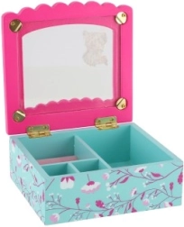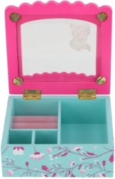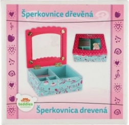 Tato dekorativní šperkovnice z kvalitního dřeva je skvělým řešením pro přehledné uložení prstýnků, náušnic a drobných pokladů. Růžové víko se skleněnou/transparentní částí a vnitřním zrcátkem usnadňuje rychlý výběr doplňků, zatímco tyrkysový spodek s jemným květinovým vzorem dodá interiéru kouzelný akcent.