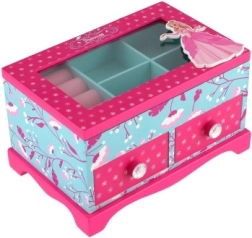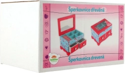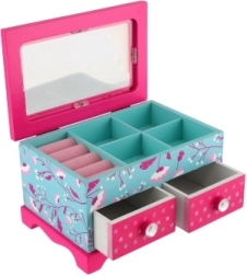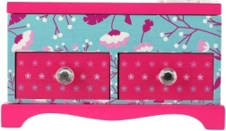 Povrch šperkovnice zdobí jemné květinové a ptačí motivy v kombinaci růžové a tyrkysově modré barvy, které krásně doplní každý dětský pokoj. Díky pevnému dřevěnému zpracování a hladkým úchytkám se s ní dětem pohodlně manipuluje. Není hračka – vhodné jako dekorační a úložný předmět.