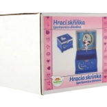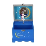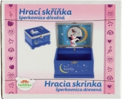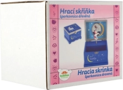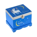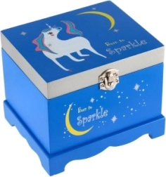 Kouzelná hrací šperkovnice pro malé parádnice v elegantní modré barvě. Uvnitř najdete zrcátko a otáčejícího se jednorožce, který po natažení klíčku zahraje melodii. Dřevěné provedení, bezpečné uložení šperků a pokladů a hravý design s hvězdami a měsíčkem z ní dělají ideální doplněk dětského pokoje.