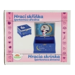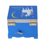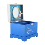 Tato dřevěná hrací šperkovnice v okouzlující modré barvě je perfektním místem pro uložení drobných pokladů, prstýnků a náramků. Víko se zrcadlem umožní rychlou kontrolu vzhledu a po natažení klíčku se uvnitř roztočí jednorožec a zazní jemná melodie.