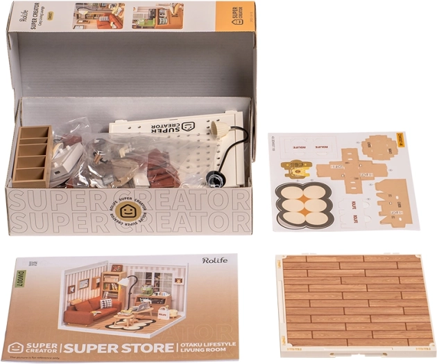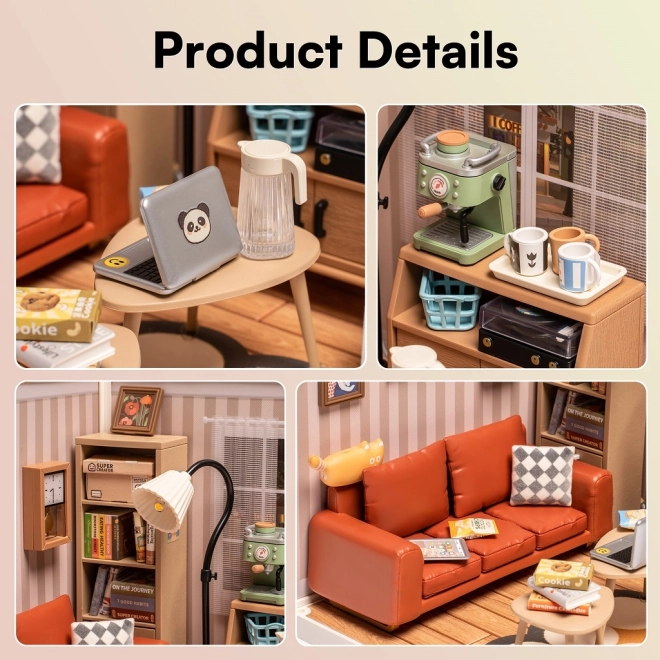 Vytvořte si vlastní koutek pohody s detailní stavebnicí miniatury od značky ROLIFE. Tento útulný obývací pokoj v tlumených kávových tónech nabízí LED osvětlení, skrytou knihovničku a spoustu drobných doplňků, které potěší každého milovníka designu, tvoření a dekorací. Ideální jako dekorace, dárek i relaxační projekt pro děti od 8 let i dospělé.