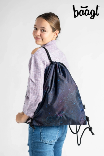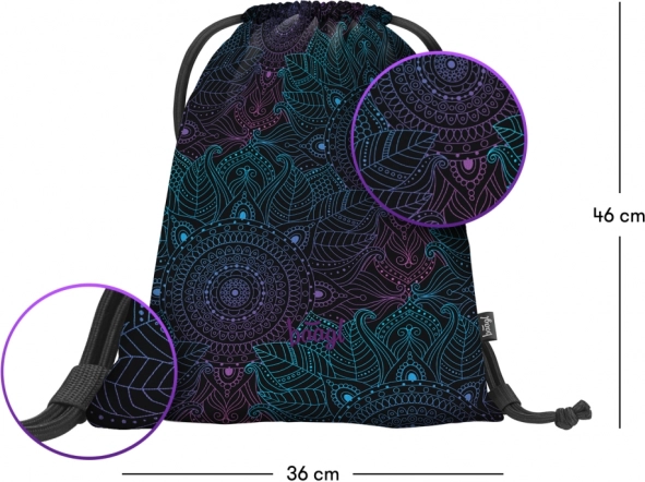 Praktický a lehký sáček BAAGL Zen zaujme moderním designem s mandalou v tónech fialové a tyrkysové na černém podkladu. Hodí se na obuv, sportovní vybavení i drobnosti, které chcete mít vždy po ruce. Díky odolnému a omyvatelnému materiálu snadno zvládne každodenní používání.
