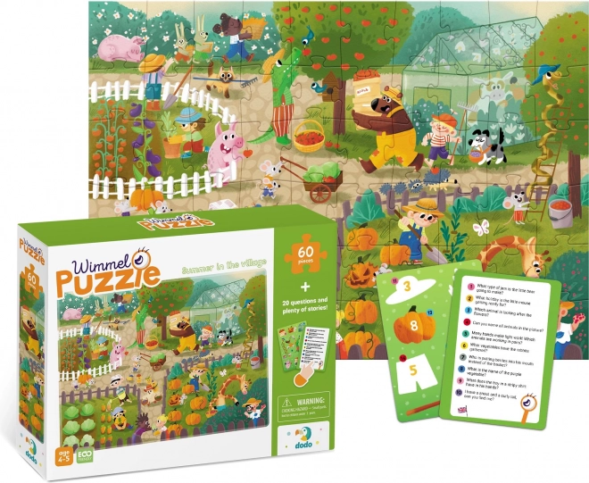 Užijte si společné skládání s roztomilým motivem léta na venkově. Puzzle s 60 dílky je ideální pro děti, rozvíjí jemnou motoriku, trpělivost a logické myšlení. Součástí balení jsou také kartičky s otázkami v cizích jazycích pro zábavné učení. Rozměr složeného obrázku je cca 32 × 23 cm.