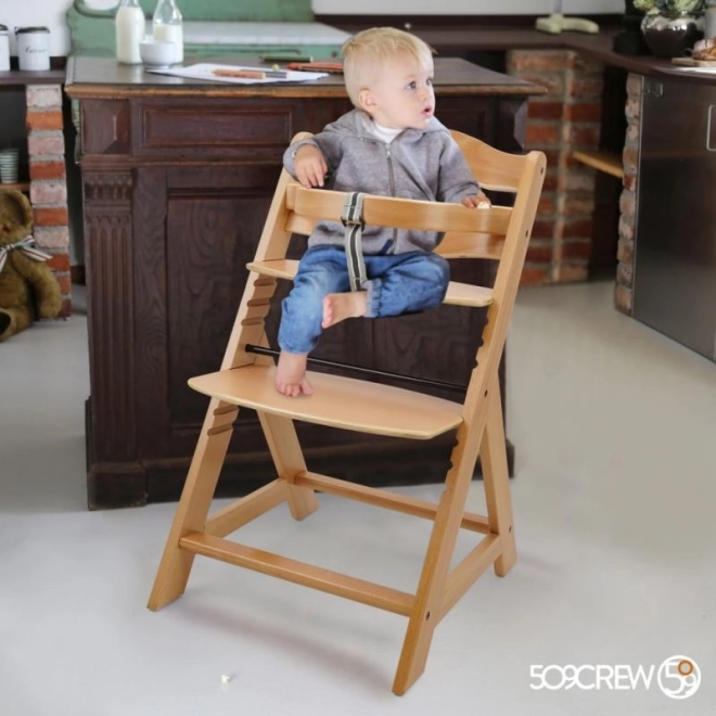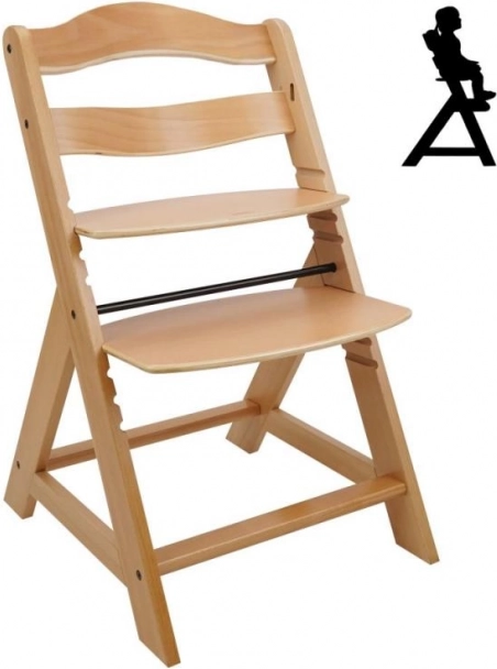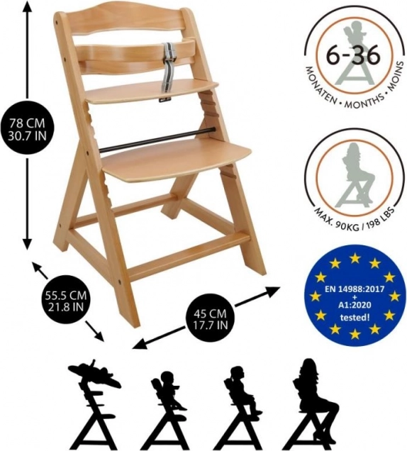 Dřevěná rostoucí jídelní židle je navržena pro maximální pohodlí a bezpečí dětí od šesti měsíců. Je vybavena vícestupňovým nastavením výšky sedáku a opěrky nohou, takže může sloužit od raného věku až po dospělost. Při dosažení staršího věku lze přední tyč a rozdělení rozkroku sejmout a židle může být přeměněna na normální židli. Je vyrobena z kvalitního německého bukového dřeva a poskytuje stabilitu a eleganci. Její maximální nosnost je až 90 kg.