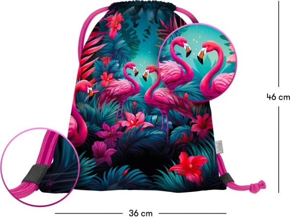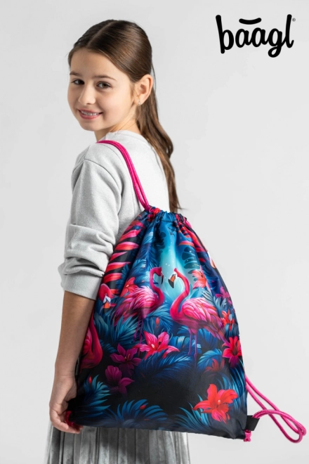 Stylový sáček s motivem plameňáků od Baagl je ideální na obuv i drobnosti pro volnočasové aktivity. Nabízí pevný omyvatelný materiál, praktickou karabinku pro připnutí na aktovku a zdrhování pomocí pevných tkanic, které umožní pohodlné nošení na zádech.