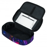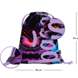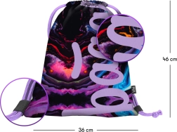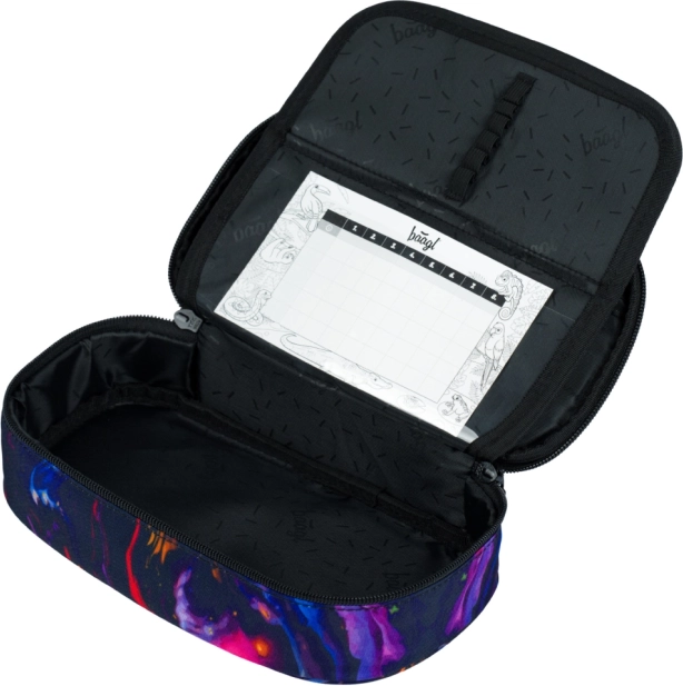 Pevný penál s výklopnou přepážkou, kapsou na zip a místem na rozvrh (bez náplně). Odolný sáček se stahováním pevnými tkanicemi pro nošení na zádech.