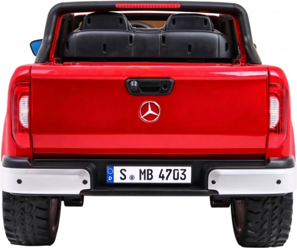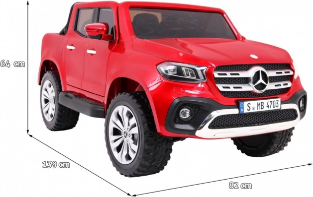 Stylový dětský elektromobil MERCEDES-BENZ X-Class v lakované červené barvě přináší realistický zážitek z jízdy díky 4 motorům 45 W, pohonu 2×/4×4, měkkým EVA kolům a odpružení. Nabízí LED světla, MP4 panel, dálkové ovládání 2.4 GHz se STOP tlačítkem, pohodlné sedadlo z eko kůže a otevírací dveře s blokací. Velký rozměr 139 × 82 × 64 cm a nosnost až 50 kg dělají z tohoto pick-upu perfektní volbu pro malé řidiče.