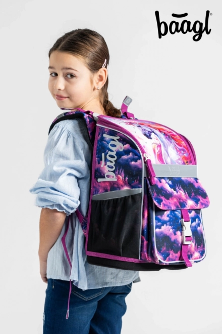 Školní aktovka BAAGL z řady zippy s kouzelným motivem Jednorožec Království je navržena pro pohodlí a zdravé nošení od 1. třídy ZŠ. Ergonomicky tvarovaná záda a posuvný zádový systém ERGO ADJUSTABLE SYSTEM umožňují přesné nastavení dle výšky dítěte. Plně nastavitelné ramenní, prsní a boční kompresní popruhy zajišťují správné usazení a stabilitu i při plném zatížení.