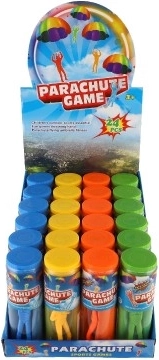 Průhledná cylindrická tuba chrání hračku a usnadňuje přenášení. Vezměte parašutistu kamkoli – na hřiště, k babičce i na dovolenou.