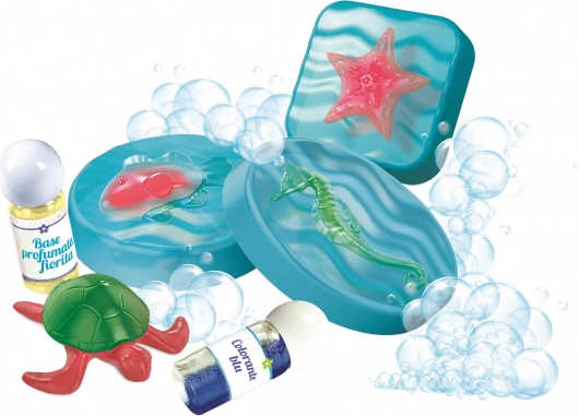 Kreativní sada CLEMENTONI na výrobu voňavých mořských mýdel. Snadný návod, formičky, barvivo a vůně. Bezpečná zábava pro děti od 8 let.