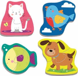 Objevte první skládačky pro batolata – 4 roztomilé puzzle ve tvaru domácích zvířátek. Každý obrázek se skládá z 2 velkých dílků, takže se děti rychle dočkají úspěchu a s chutí skládají znovu a znovu. Syté barvy a přívětivé ilustrace přirozeně lákají ke hře.