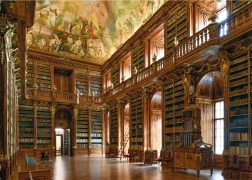 - Historická knihovna, interiér s freskami a dřevěnými regály