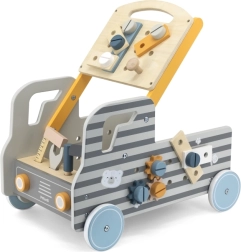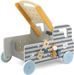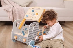 Tento pojízdný ponk ve tvaru auta kombinuje pracovní stůl s interaktivní stavebnicí. Vše je vyrobeno ze dřeva a přizpůsobeno malým rukám, aby si děti mohly bezpečně vyzkoušet práci s nástroji. Sada povzbuzuje zvědavost, trpělivost a podporuje koordinaci ruka–oko.