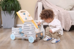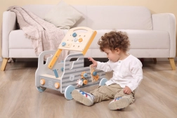 Pracovní stůl s nářadím, který si děti snadno odvezou. Vozík s úložným prostorem učí pořádkumilovnosti a podporuje samostatnou hru.