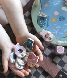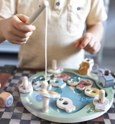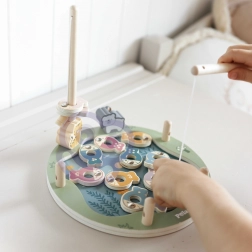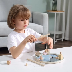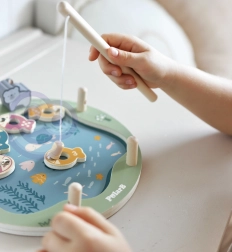 Dřevěná magnetická hra rybolov je skvělá volba pro první společenské hry. Barevné, očíslované rybičky s tečkami se chytají pomocí magnetických prutů, děti tak zábavnou formou procvičují počítání, soustředění a trpělivost. Kostka přidává do hry náhodu a napětí – vyhrává ten, kdo uloví správnou rybku.