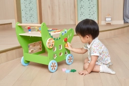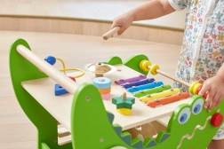 - ksylofon, počítadlo, labyrint se zvířátky, ozubená kola, třídicí box tvarů, otočné kostky s čísly a obrázky, motorická smyčka s 5 korálky, posuvný blok, zvonivý talíř, gong, kolíková skládačka