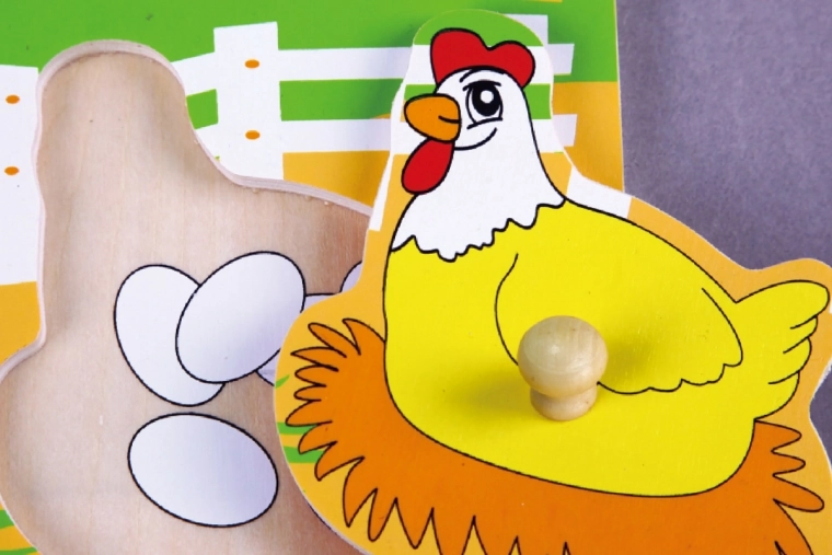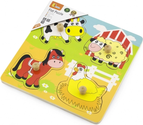 Odolná dřevěná deska o přibližných rozměrech 22 × 22 cm je bohatě ilustrovaná farmářským motivem, který děti motivuje k dalšímu hraní a rozvoji slovní zásoby (např. kráva, ovečka, kůň, slepice). Hračka je vhodná od 12 měsíců a díky kompaktním rozměrům se snadno uklízí i přenáší.