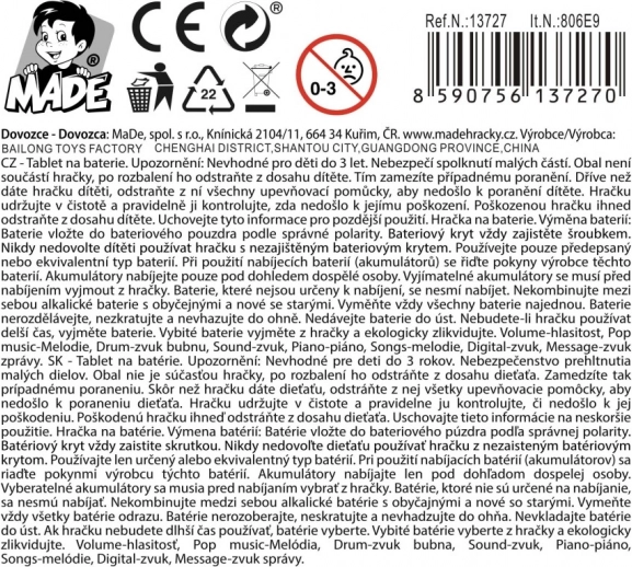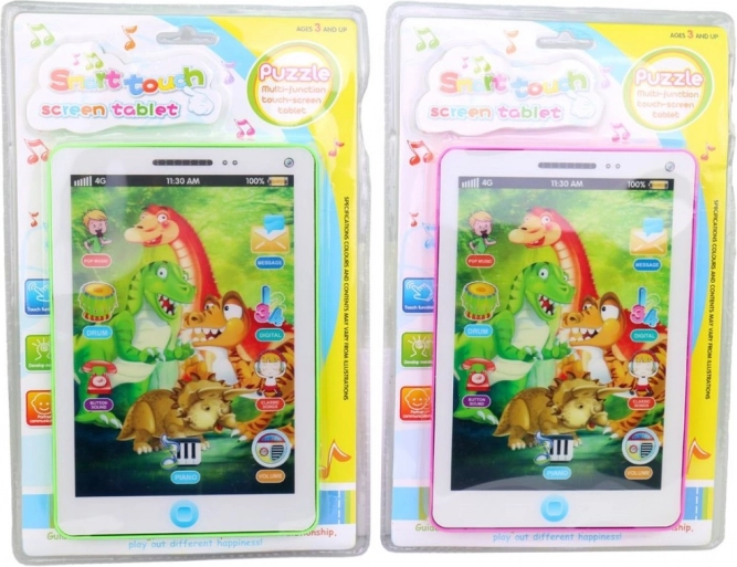 Multifunkční dětský tablet na baterie pro děti 3+. Lehký plast, rozměry 20 × 13 × 1,5 cm, balení blister card. Napájení 3× AAA (nejsou součástí).