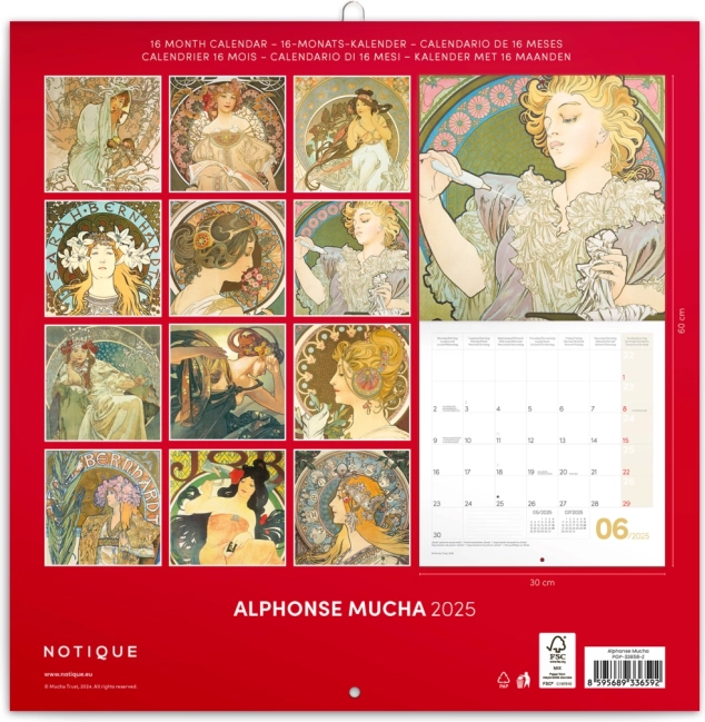 Objevte kouzlo secesního umění s poznámkovým kalendářem ALFONS MUCHA 2025 ve formátu 30 × 30 cm. Každý měsíc zdobí ikonické motivy slavného českého malíře, které vašemu interiéru dodají eleganci a nadčasový styl. Kalendář nabízí pohodlné psací pole pro každodenní plánování a jasně strukturované informace.
