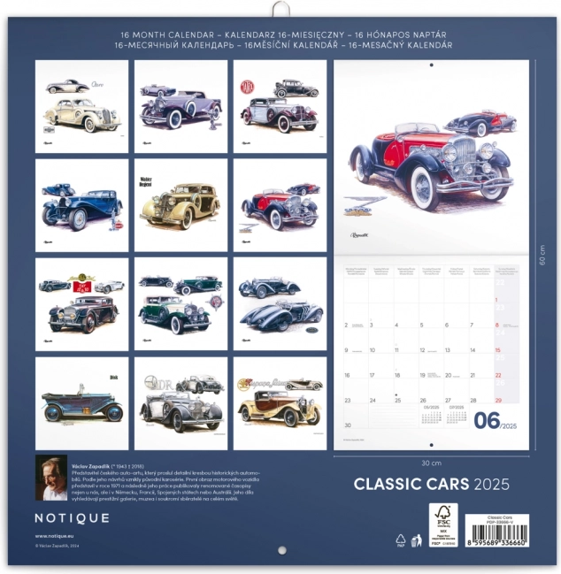 Objevte eleganci klasických automobilů v poznámkovém nástěnném kalendáři pro rok 2025 s díly VÁCLAVA ZAPADLÍKA. Každý měsíc zdobí detailně propracovaná ilustrace legendárních veteránů, které potěší sběratele, automobilové nadšence i milovníky nadčasového designu.