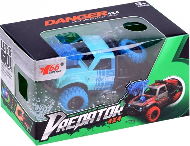 Zábavné kovové autíčko 4x4 Predator přináší akční jízdu s pružinovým nátahovým pohonem, světelnými efekty a realistickými zvuky motoru, nárazu i alarmu. Díky odolné konstrukci s kovovou karoserií, gumovými pneumatikami a pevným podvozkem zvládne i divoké kaskadérské kousky.