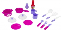 Hrnec a pánev s poklicemi, šálky s talířky, náčiní, kořenky i láhev kečupu – vše pro realistickou hru na vaření.