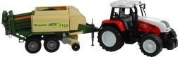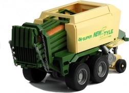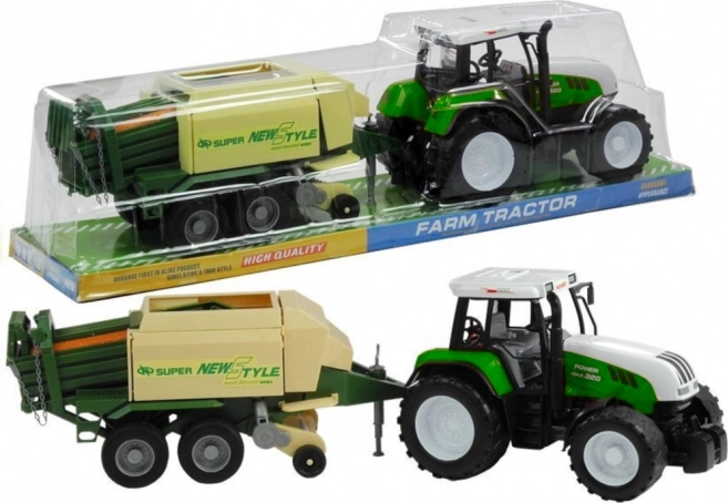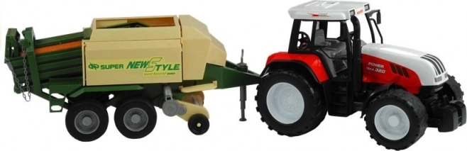 Přívěs zahrnuje pohyblivé části jako vysouvací oporu, otočný sběrací podávací mechanismus a otevíratelné boční a zadní klapky. Tento vzrušující traktor je dostupný v červené a zelené barvě, což přidává na autentičnosti a zábavě.