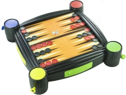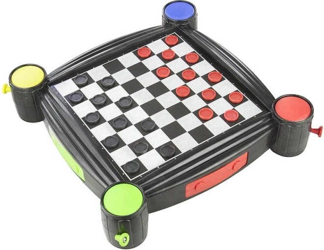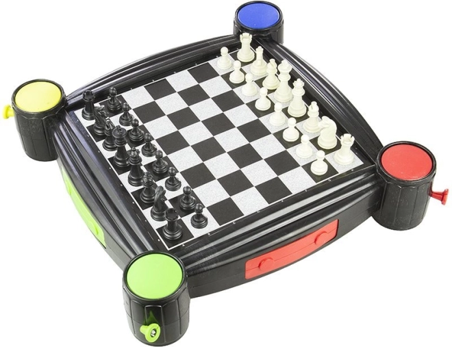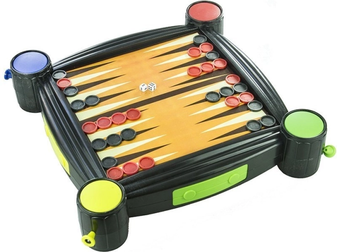 Univerzální rodinná sada stolních her 7 v 1 s oboustrannou deskou a integrovanými vrhači kostek v rozích. Obsahuje Šachy, Dámu, Backgammon, Člověče, nezlob se!/Ludo, Hady a žebříky i Husí hru. Kompaktní provedení je ideální na doma i na cesty, pro 2–4 hráče a děti od 3 let.