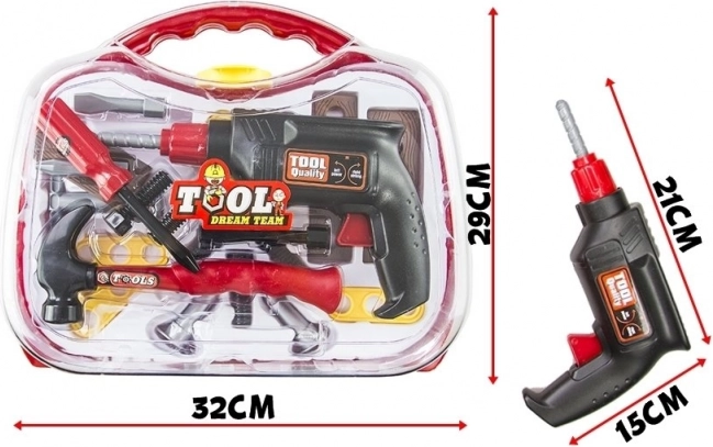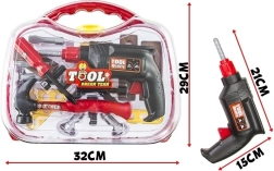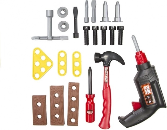 Součástí je realistická hračka vrtačky, funkční šroubovák s výměnnými nástavci, kladívko, šrouby a tři destičky k procvičování montáže. Vše je vyrobeno z lehkého, odolného plastu bezpečného pro dětské hraní.