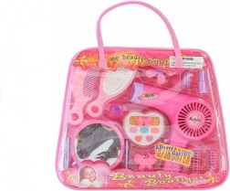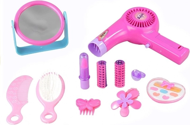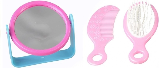 - Hračkový fén na baterie, zrcátko na stojánku, kartáč, hřeben, 2× natáčky, sponka motýlek, gumička s kytičkou, paletka stínů, rtěnka, prstýnek