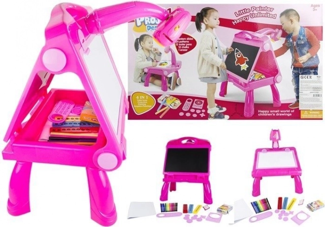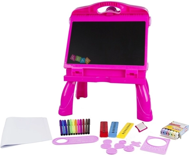 Růžová tabule s projektorem je ideálním dárkem pro každou malou holčičku, která miluje kreslení a malování. Oboustranná tabule umožňuje tvoření s použitím fixů i barevných kříd, což napomáhá rozvíjet umělecké schopnosti, představivost a koordinaci.