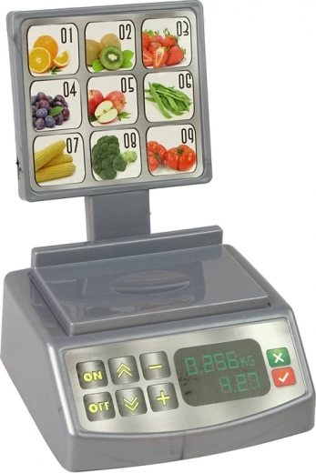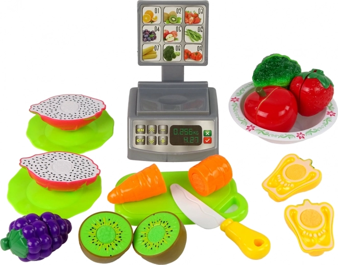 - Košík, obchodní váha, prkénko, nožík, talířky, miska, plastové ovoce a zelenina (mrkev, brokolice, paprika, kiwi, jahoda, jablko, hrozny)