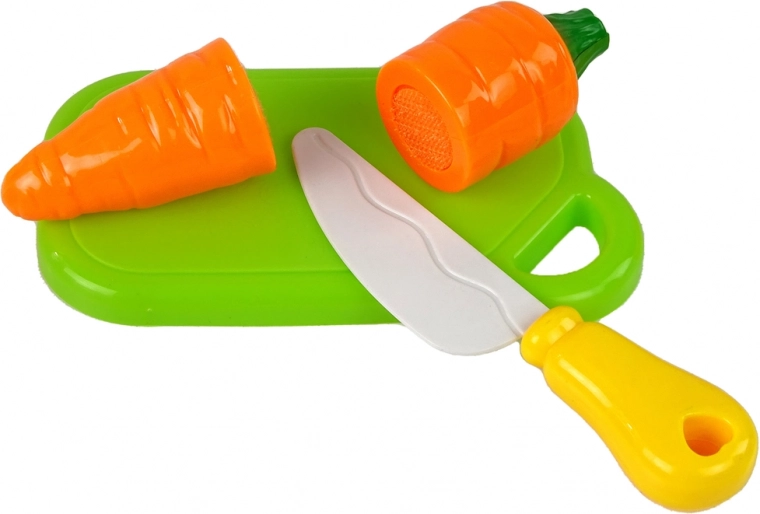 Součástí je nožík, prkénko, talířky a mistička – vše z bezpečného, certifikovaného plastu s CE. Ideální pro děti od 3 let, které se tak hravou formou seznamují s kuchyní i zdravými potravinami.