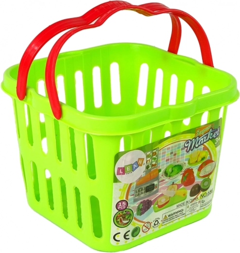 Pevný zelený košík s červenými uchy pohodlně přenese všechny doplňky. Děti si v něm uspořádají ovoce, zeleninu i náčiní a mají vše vždy po ruce.