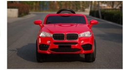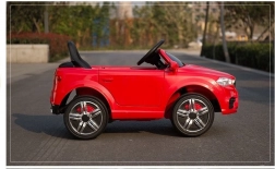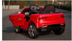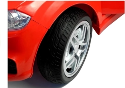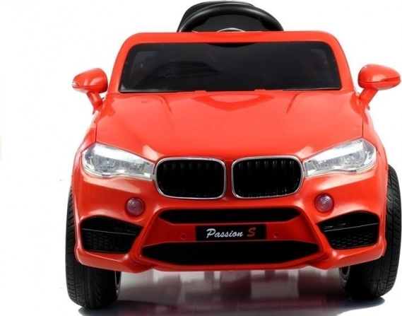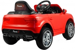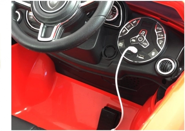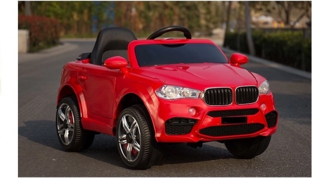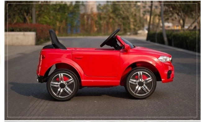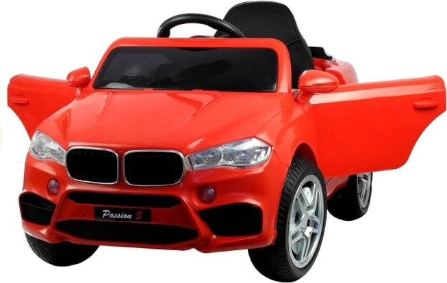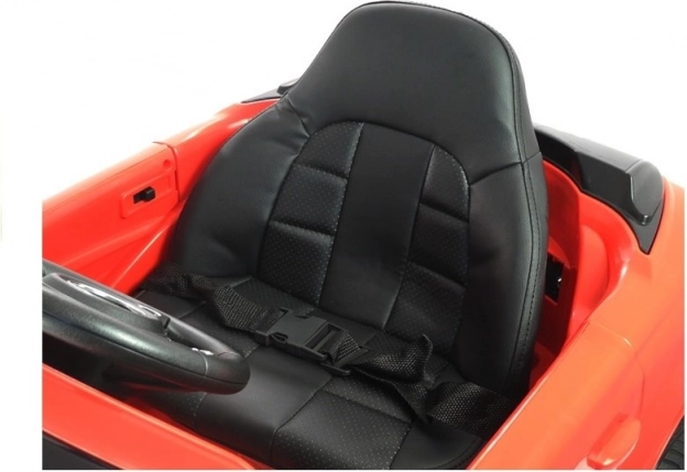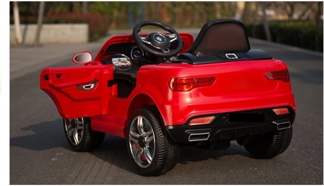 Červené elektrické autíčko je pečlivě vypracováno, aby vypadalo jako skutečný luxusní vůz s detaily, jako jsou světla a otvírací dveře.