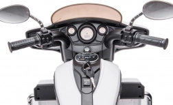 Řídítka s madly, zrcátka, čelní štít a přehledné budíky vytvářejí autentický zážitek z jízdy jako na skutečné motorce.