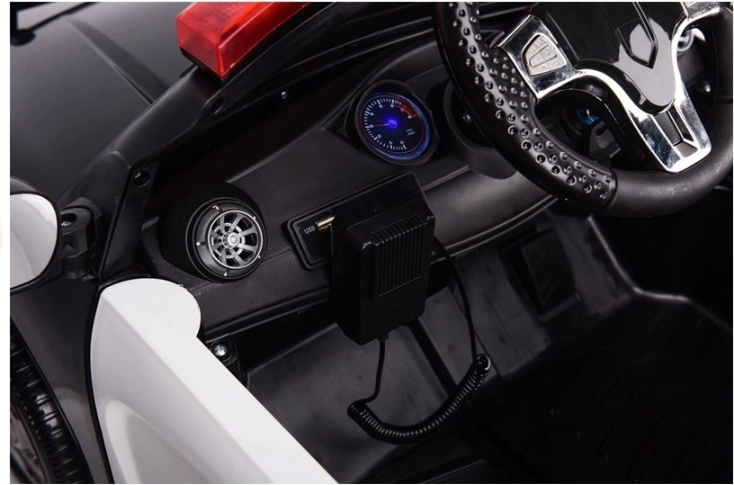 Interiér potěší pohodlnou sedačkou z eko kůže, ergonomickým volantem a modře podsvícenou palubní deskou s imitacemi přístrojů. Součástí je audio panel s porty MP3, USB a TF, díky kterému si děti mohou pouštět oblíbené melodie během jízdy. Kola z EVA materiálu zaručují tichou a pohodlnou jízdu na různých površích.