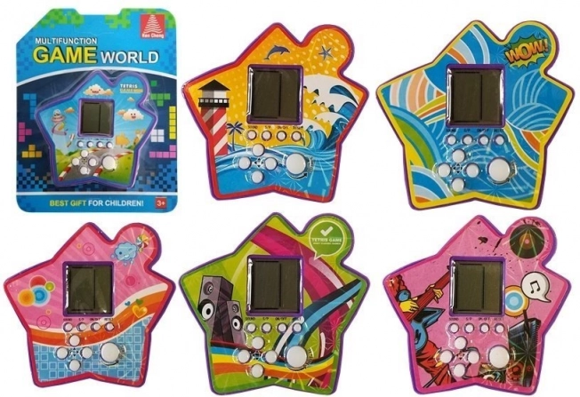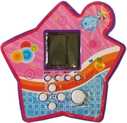 Elektronická hra ve tvaru hvězdy je velmi lehká a díky kompaktním rozměrům ji můžete snadno vzít s sebou. Obsahuje displej a bílá tlačítka pro funkce hry, jako je spuštění, pozastavení, ztlumení zvuku nebo reset.