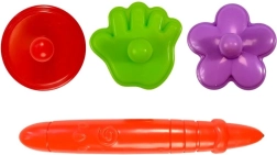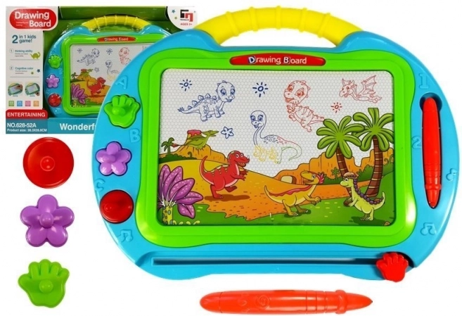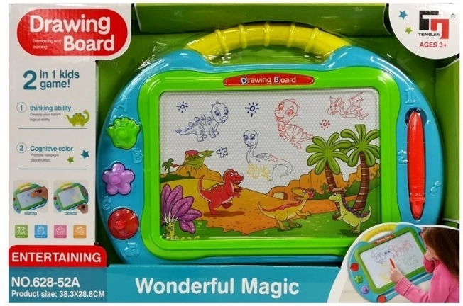 Tato velká magnetická kreslicí tabulka umožňuje dětem kreslit a psát znovu a znovu – bez nepořádku a bez papíru. Pod povrchem obrazovky jsou železné piliny, které se při dotyku magnetického pera skládají do viditelných stop. Razítka ve tvaru kolečka, tlapky a kytičky dodají obrázkům originální detaily a pomohou rozvíjet představivost.