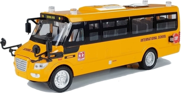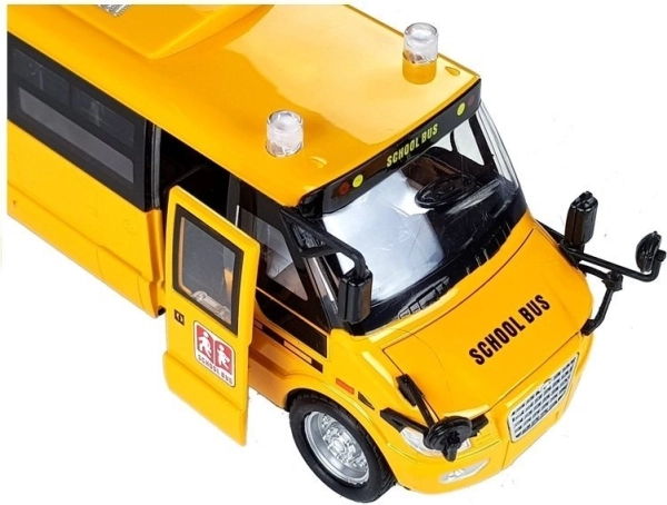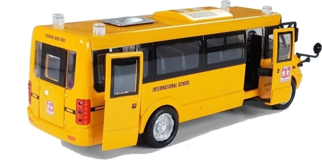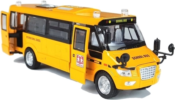 Boční i zadní dveře a kapota se otevírají, průhledná okna a precizní drobnosti (zrcátka, poklice, nápisy) vytvářejí autentický vzhled školního autobusu.