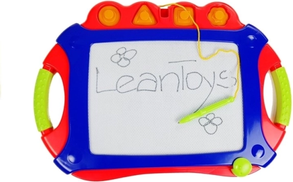 Tato velká magnetická tabulka kombinuje zábavu a učení. Díky speciálnímu povrchu a přiloženému stylusu vytváří děti barevné obrázky, které lze jediným tahem mazací lišty snadno smazat. Čtyři stempelky s geometrickými tvary pomáhají s procvičováním tvarů a tvorbou vzorů.