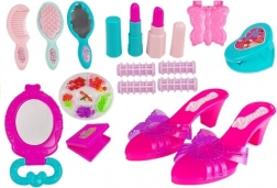 V balení nechybí nezbytnosti pro malé stylistky: pohodlné plastové sandálky, sada na úpravu vlasů včetně kartáče, hřebenu a natáček, oválné zrcátko, korálky pro výrobu šperků a imitace rtěnek. Vše je přehledně uloženo v kufříku s rukojetí a zacvakávacím víkem, takže se nic neztratí a uklízení je hračka.
